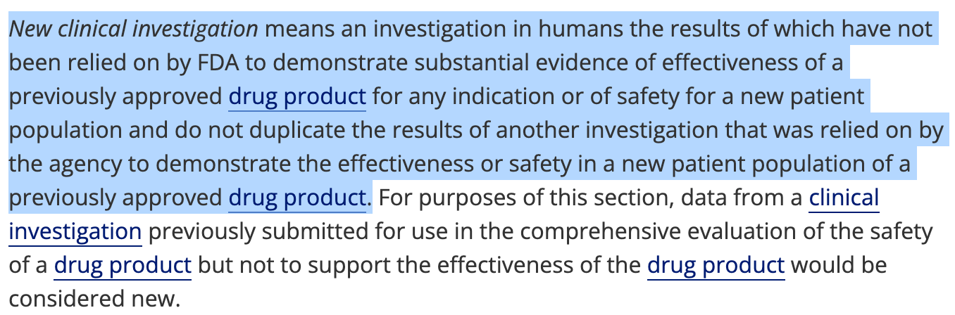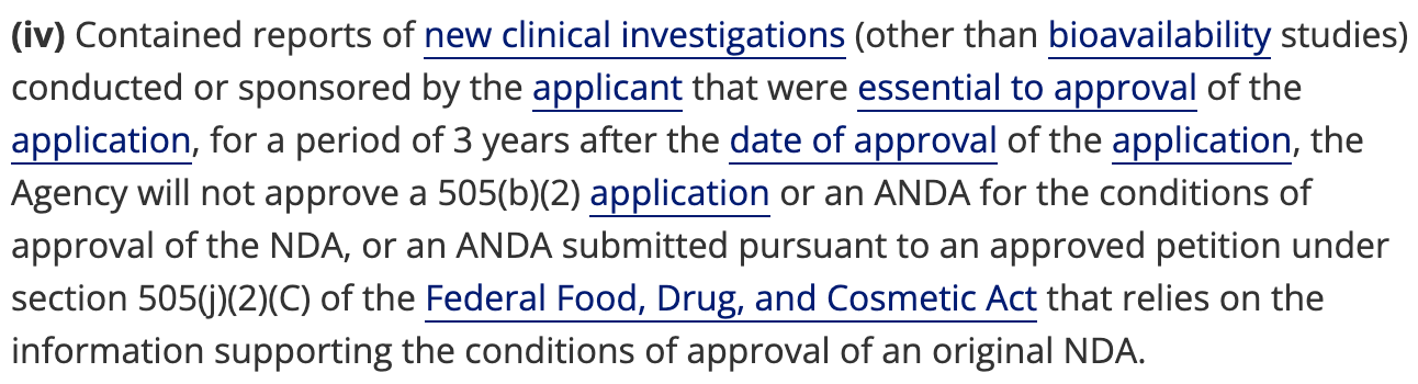 The basis for this new exclusivity originates in 21 C.F.R. § 314.108, which allows for additional 3-year exclusivity periods for NDAs containing New Clinical Investigations which are essential to the approval of the NDA.