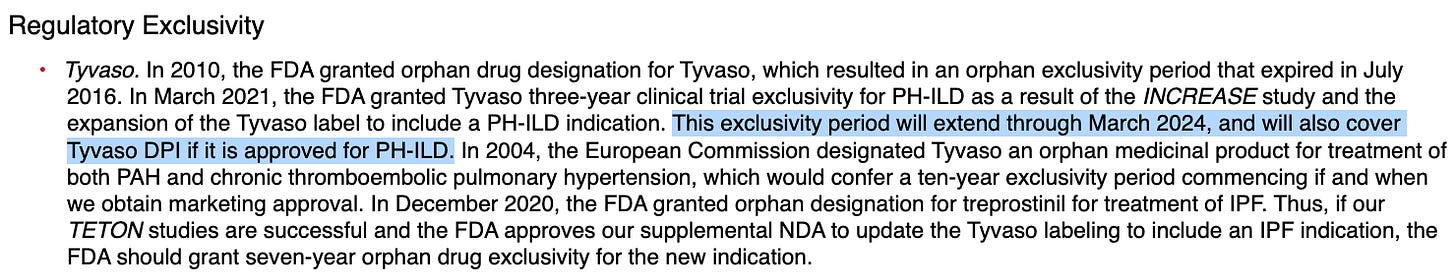 The exclusivity was a surprise to everyone involved—including apparently both Liquidia’s and United Therapeutics’ management teams. United, for example, previously said in its 2021 Annual Report that it expected the Tyvaso exclusivity to terminate in March of 2024: