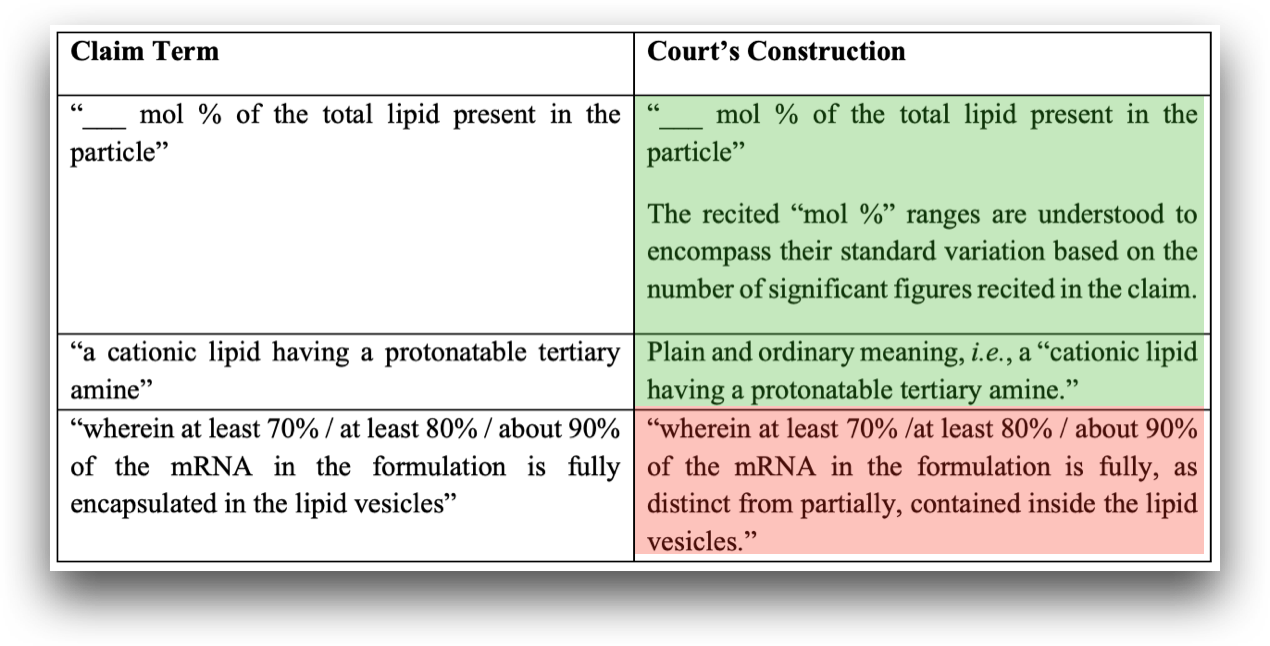 The ruling was largely favorable to Arbutus. Of the three main claims being construed, Arbutus won on two—very likely the more important two. Moderna won on one.