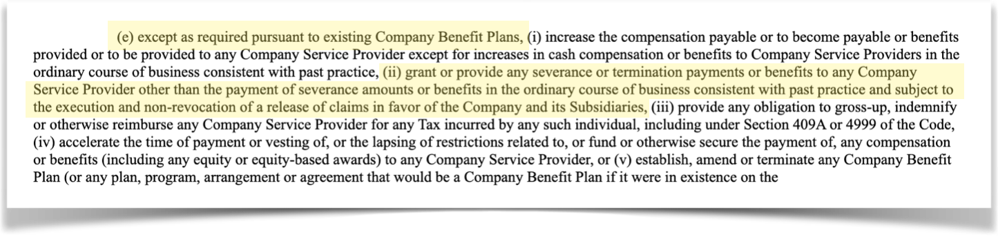 “except as required pursuant to existing Company Benefit Plans . . . [Twitter shall not] grant or provide any severance or termination payments or benefits to any Company Service Provider other than the payment of severance amounts or benefits in the ordinary course of business consistent with past practice and subject to the execution and non-revocation of a release of claims in favor of the Company and its Subsidiaries” (emphasis added).