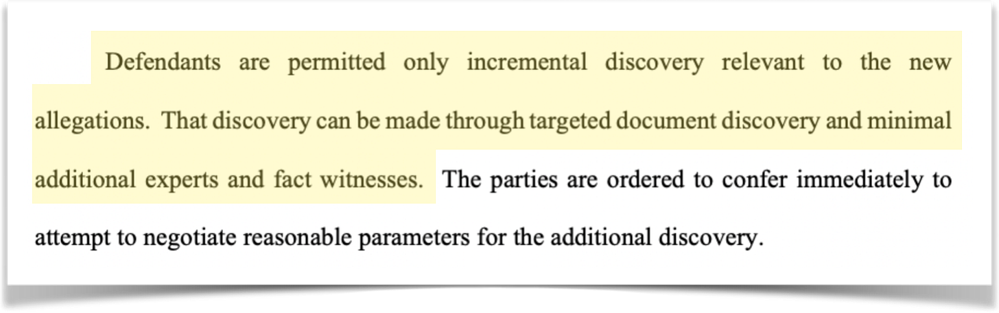It’s a smart move by McCormick. Denying the motion to amend the pleadings would have been a potentially reversible issue on appeal. It was a high bar for Twitter to succeed in opposing such a motion. But the ultimate outcome at trial is unlikely to change. McCormick is drawing the lines of discovery on Zatko-related issues narrowly, saying