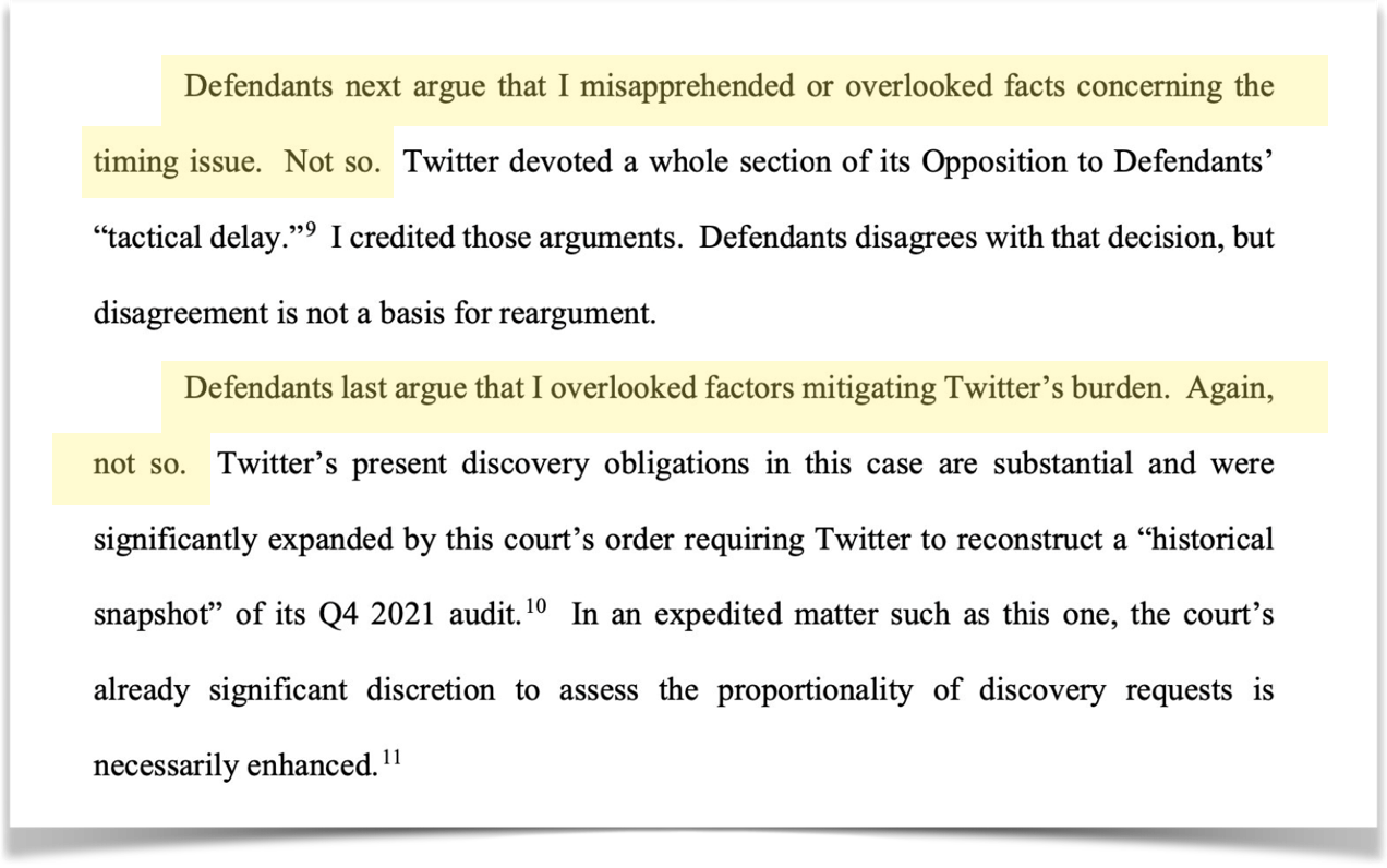 It was a marked departure from her tempered, almost soft-spoken demeanor, and should be acknowledged in context of Twitter’s accusations of gamesmanship (not to mention bad faith). Her quip found its way into her ruling the following day as well: